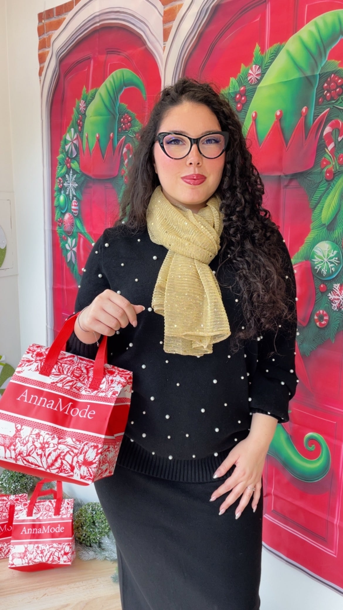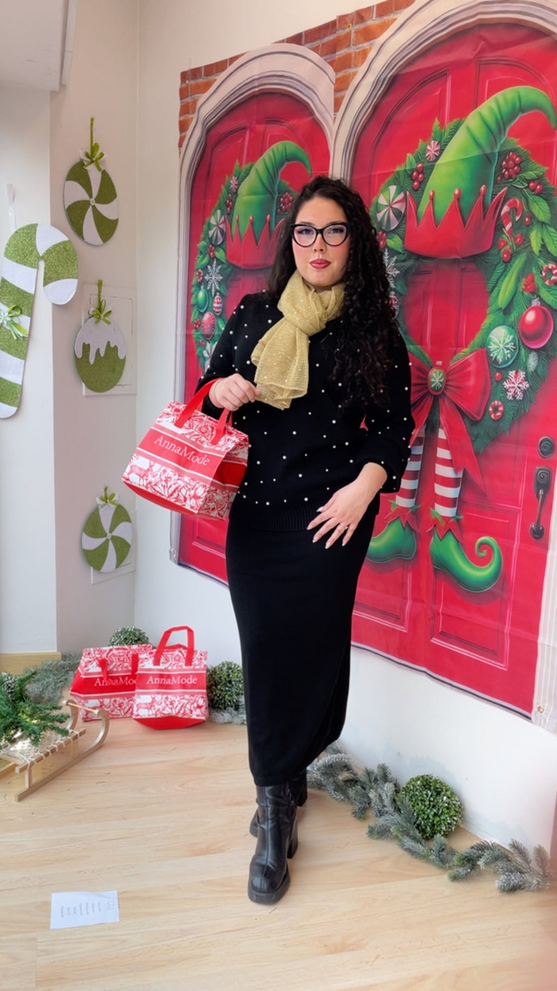 Completo Praga: il dono natalizio che incanta. Morbidissima maglia che avvolge con eleganza e comfort, perfetta per le festività. Ogni acquisto include una sciarpa natalizia esclusiva e una borsa AnnaMode natalizia, trasformando il tuo regalo in un'esperienza completa di lusso. Sorprendi chi ami con uno stile sofisticato e dettagli curati che catturano l'essenza del Natale. Un completo che celebra bellezza, calore e generosità in ogni fibra.