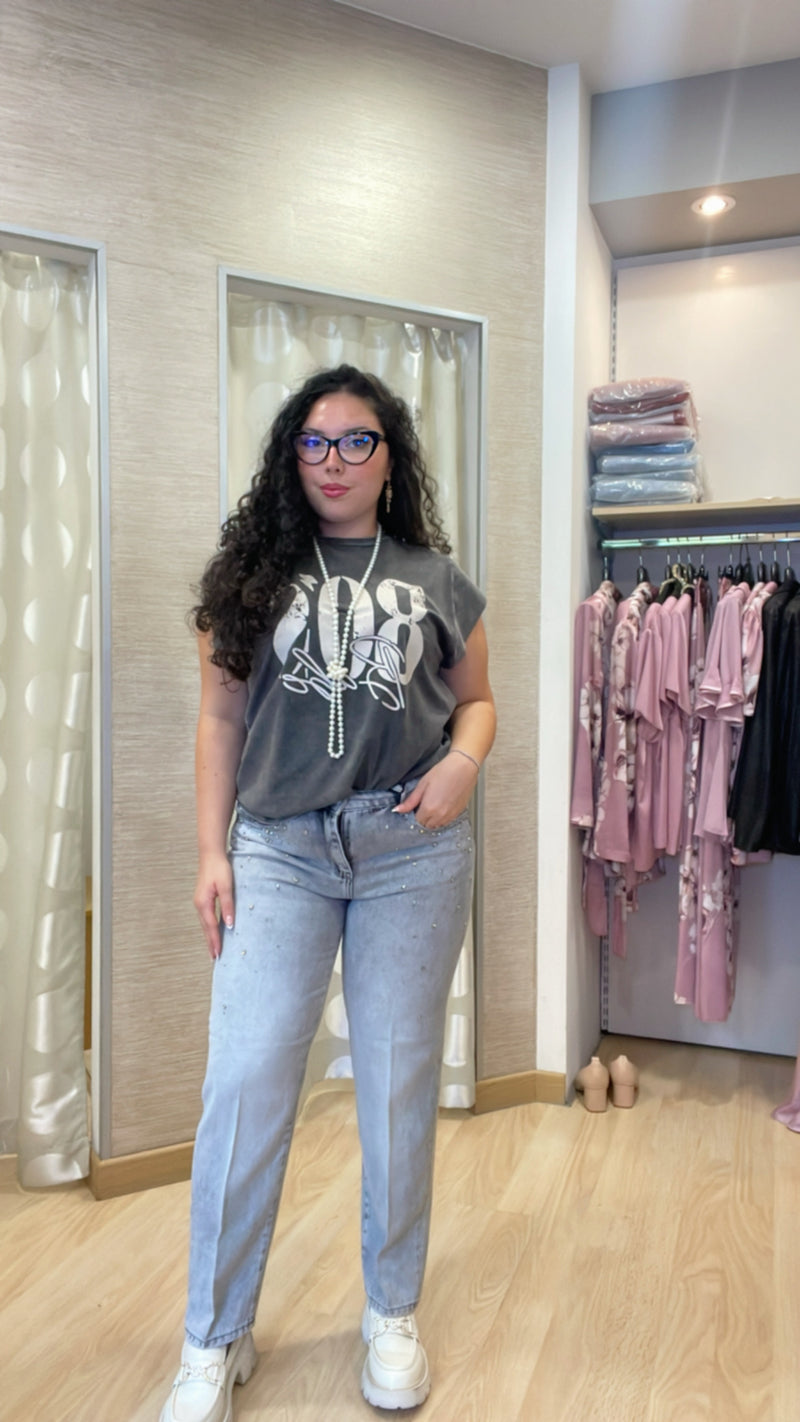 Aggiungi un tocco di lusso al tuo guardaroba con i Jeans Denim Grey in tessuto tencel pregiato. Lasciati conquistare dai particolari artigianali come borchie e brillantini che rendono ogni capo unico e fatto a mano. Dai un tocco unico e di stile al tuo look con questi jeans di alta qualità!