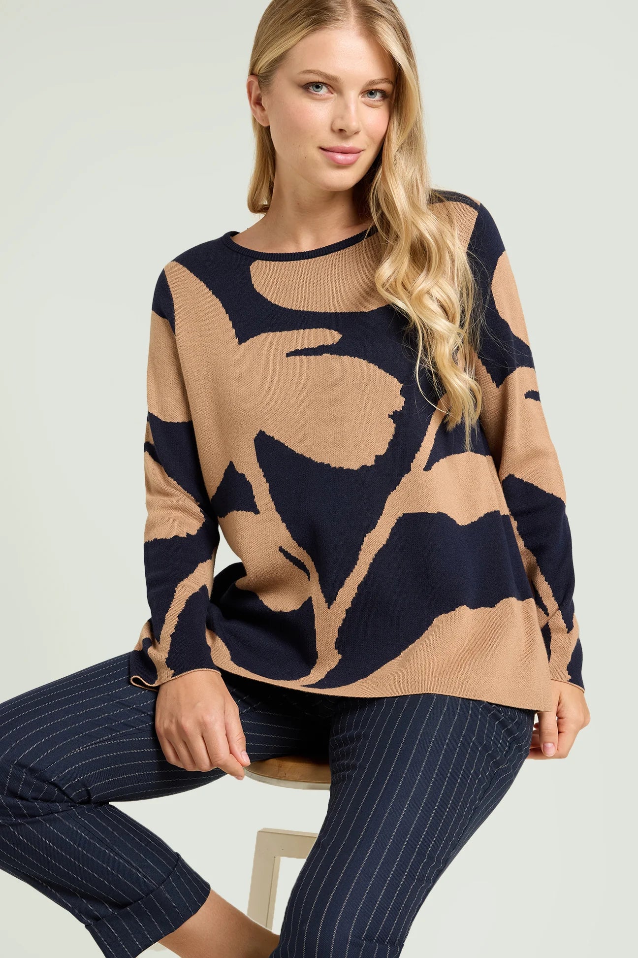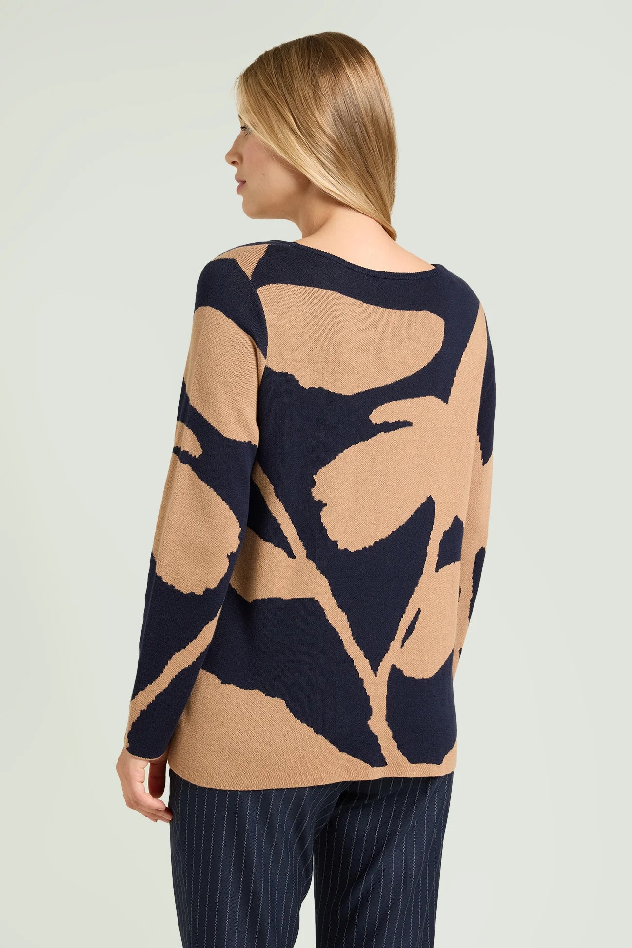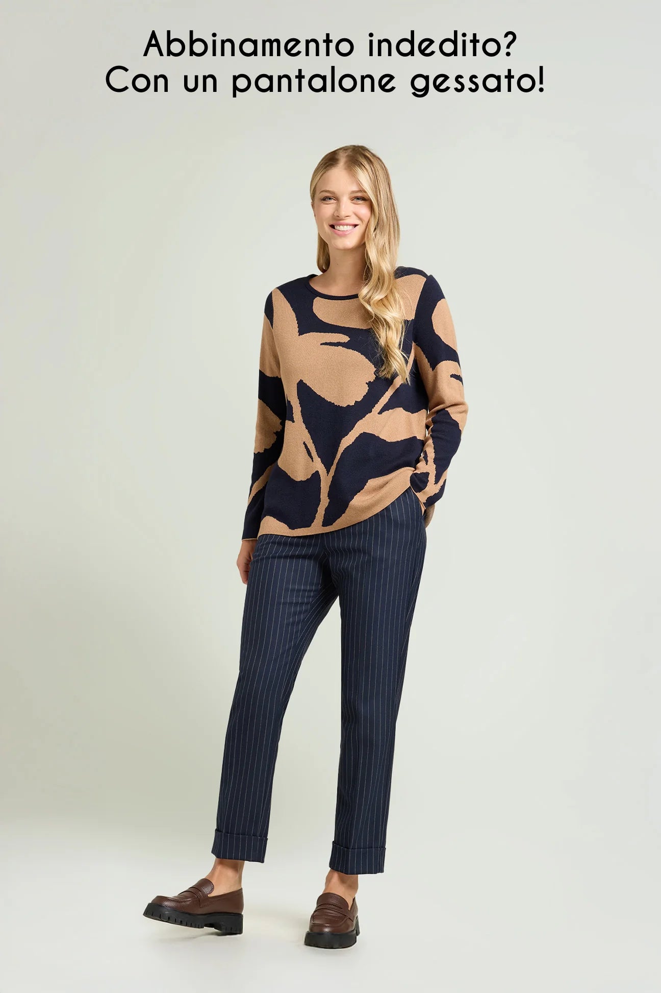 L'elegante maglia Luisa Viola è realizzata in un morbido mix di cotone e viscosa, con una lavorazione jacquard che dona una sensazione di calore e morbidezza. La scollatura rotonda e la finezza 12 la rendono perfetta per ogni occasione. Il design astratto e floreale unisce il blu e il cammello in un perfetto connubio di stile e classe.