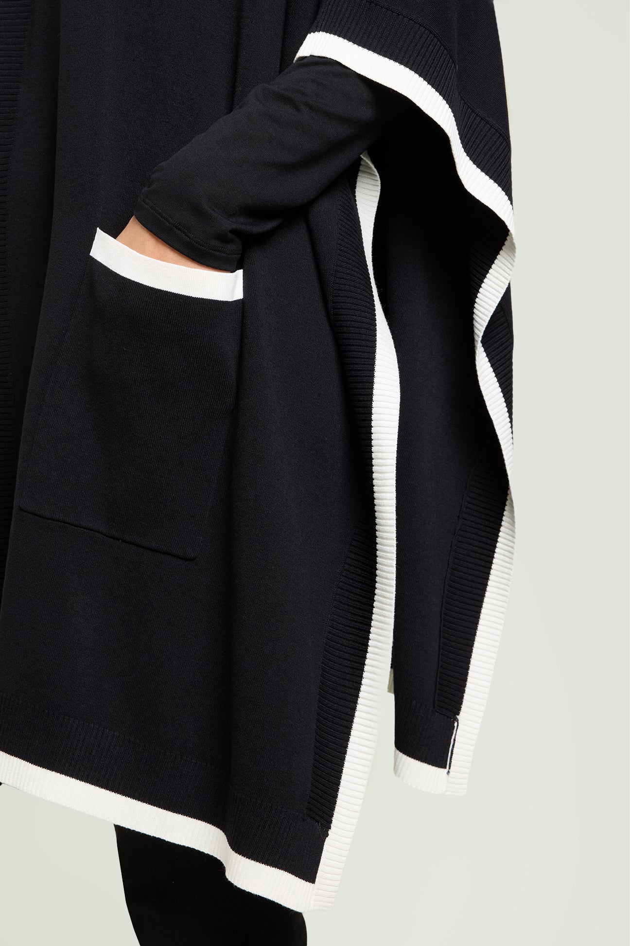 Questa elegante maglia Luisa Viola sarà un must-have nel tuo guardaroba. La sua mantella in maglia particolare e versatile, in un classico nero con profili bianchi, veste dalla Taglia 46 alla 62. Con una vestibilità perfetta e un design moderno, sarai sempre alla moda