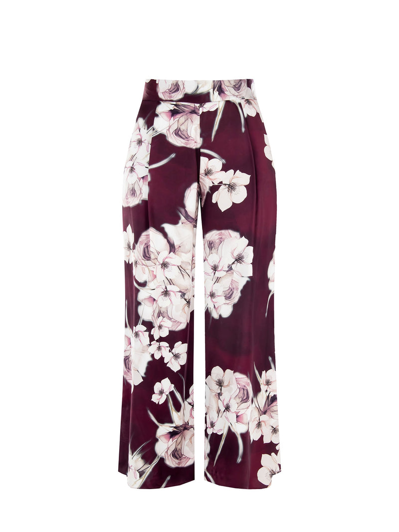Questo pantalone in raso bordeaux con delicata fantasia floreale unisce eleganza e raffinatezza, perfetto per cerimonie e occasioni speciali. Il tessuto lucido valorizza ogni movimento, donando un tocco sofisticato al tuo look. Scegli un capo che esprime stile e classe in ogni dettaglio.