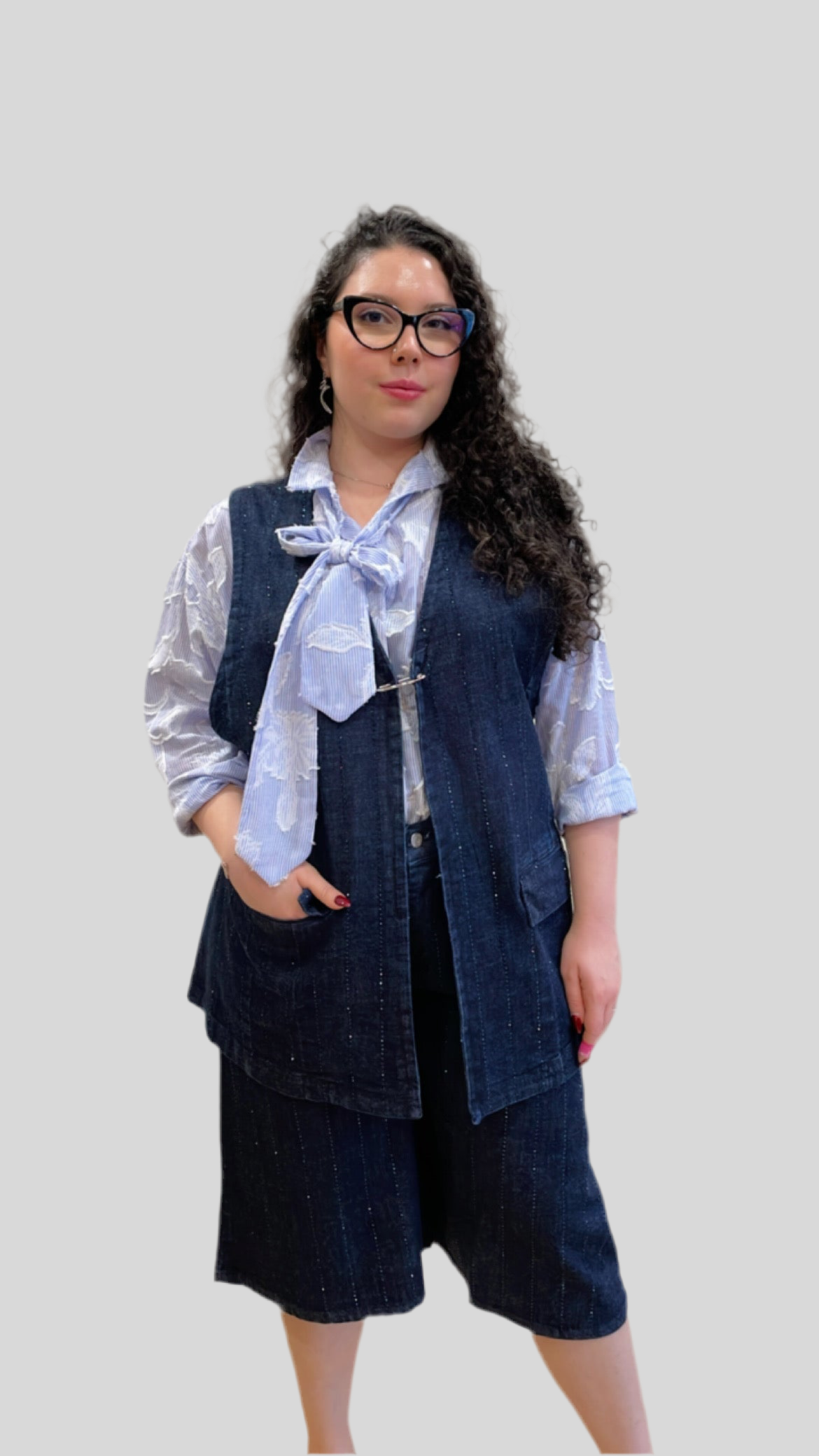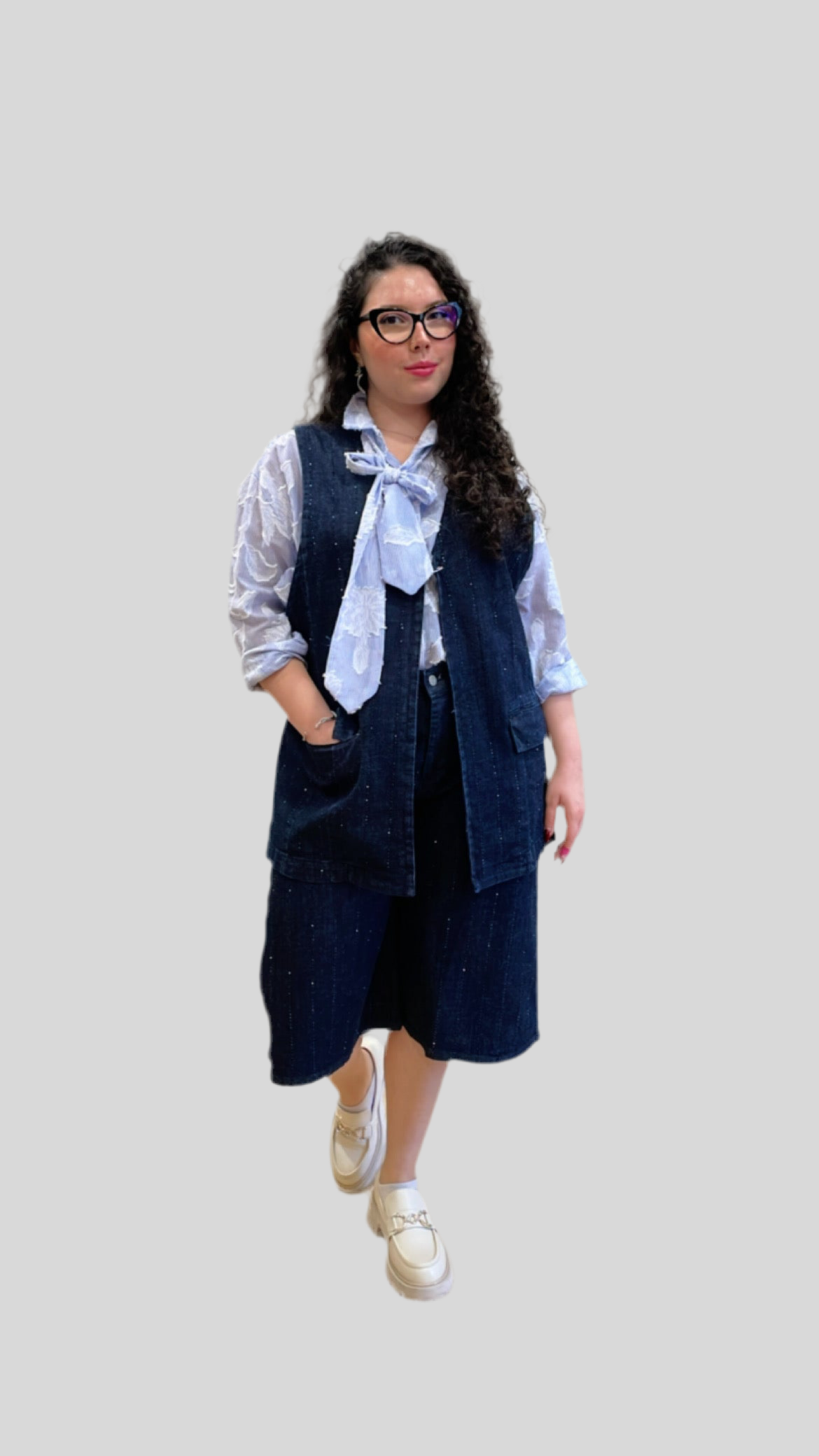 Un tocco brillante per il tuo look con il nostro Gilet jeans brillantinato Curvy. Grazie alla sua finitura luccicante, aggiunge un tocco di eleganza e luminosità al tuo outfit. Perfetto per dare un tocco sofisticato e originale a qualsiasi look. Non passare inosservata con il nostro gilet brillante e chic.