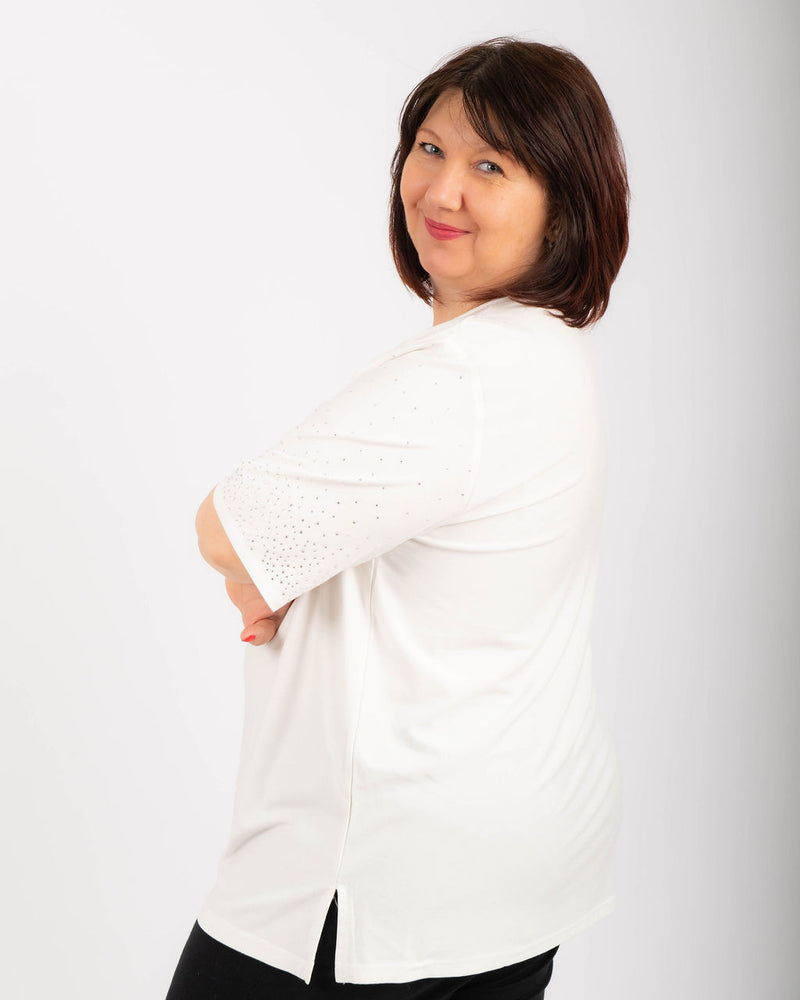 Esalta la tua femminilità con la T-shirt Curvy manica strass! Realizzata in morbida viscosa, non appiccica e dona una silhouette curvy perfetta. Dettagli in strass sulla manica aggiungono un tocco di eleganza. Non perdere l'opportunità di sentirti sicura e bella con questa maglietta unica!